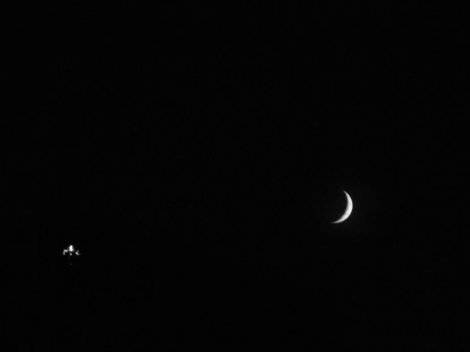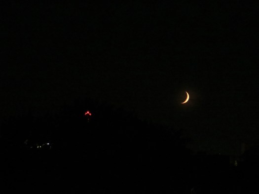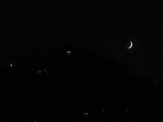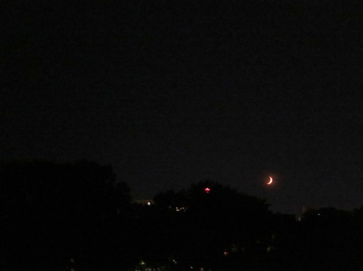 One night, a little over a week ago, I stepped out on my balcony and watched the waxing moon dangle just above the horizon. It mingled there with the red cross on top of the hospital across the river and a few other lights that poked out through the trees. I considered getting my little camera, but hesitated knowing moon shots are a stretch for it. I was feeling a bit sleepy and stepped back inside. But before I knew it I was out there again, stretching to the moon.