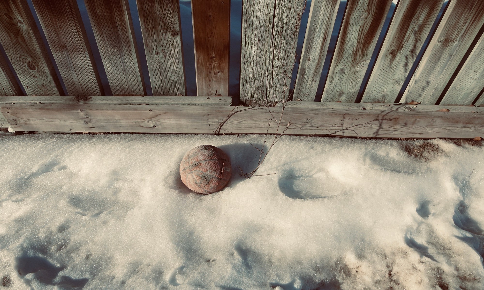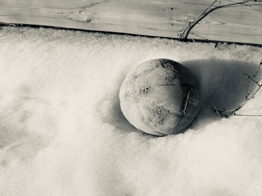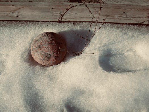 Take a small, slightly deflated, and dirt-flecked basketball nestled into the melting snow. Add a fence that’s lost some of its paint, a little branch waiting for spring, and sunlight to create a shadow. You get beauty with a bit of grit.