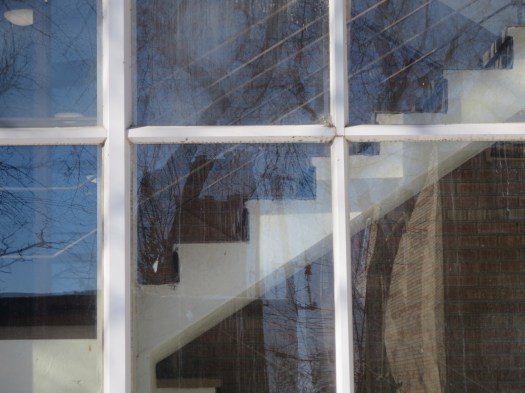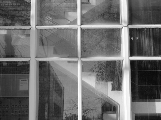 Keep walking and find a mundane, what I call Monopoly game piece, apartment building. Notice the stairs through the condensation-dirt-streaked windows and the reflections.
