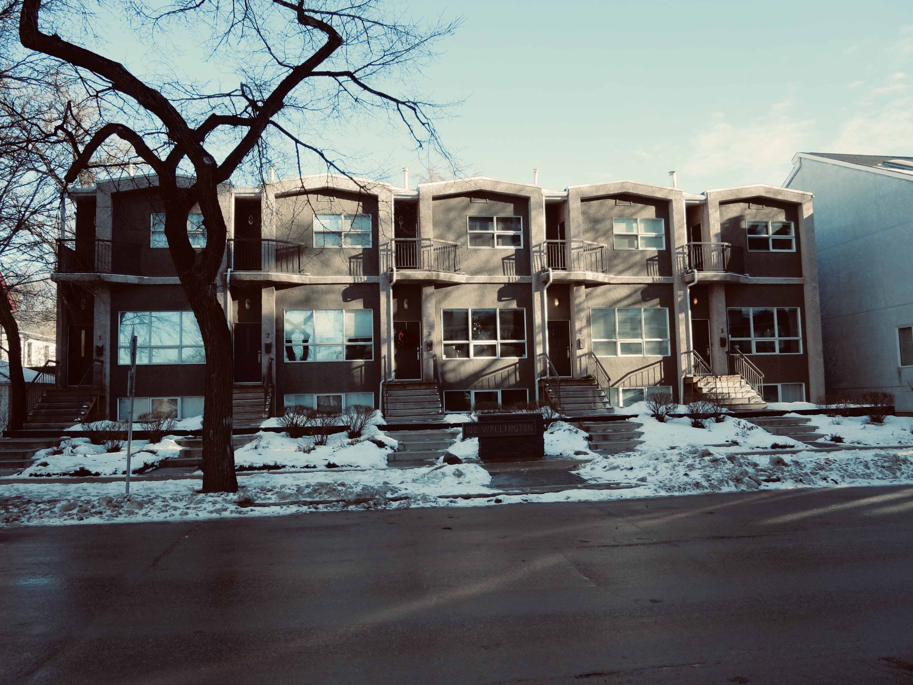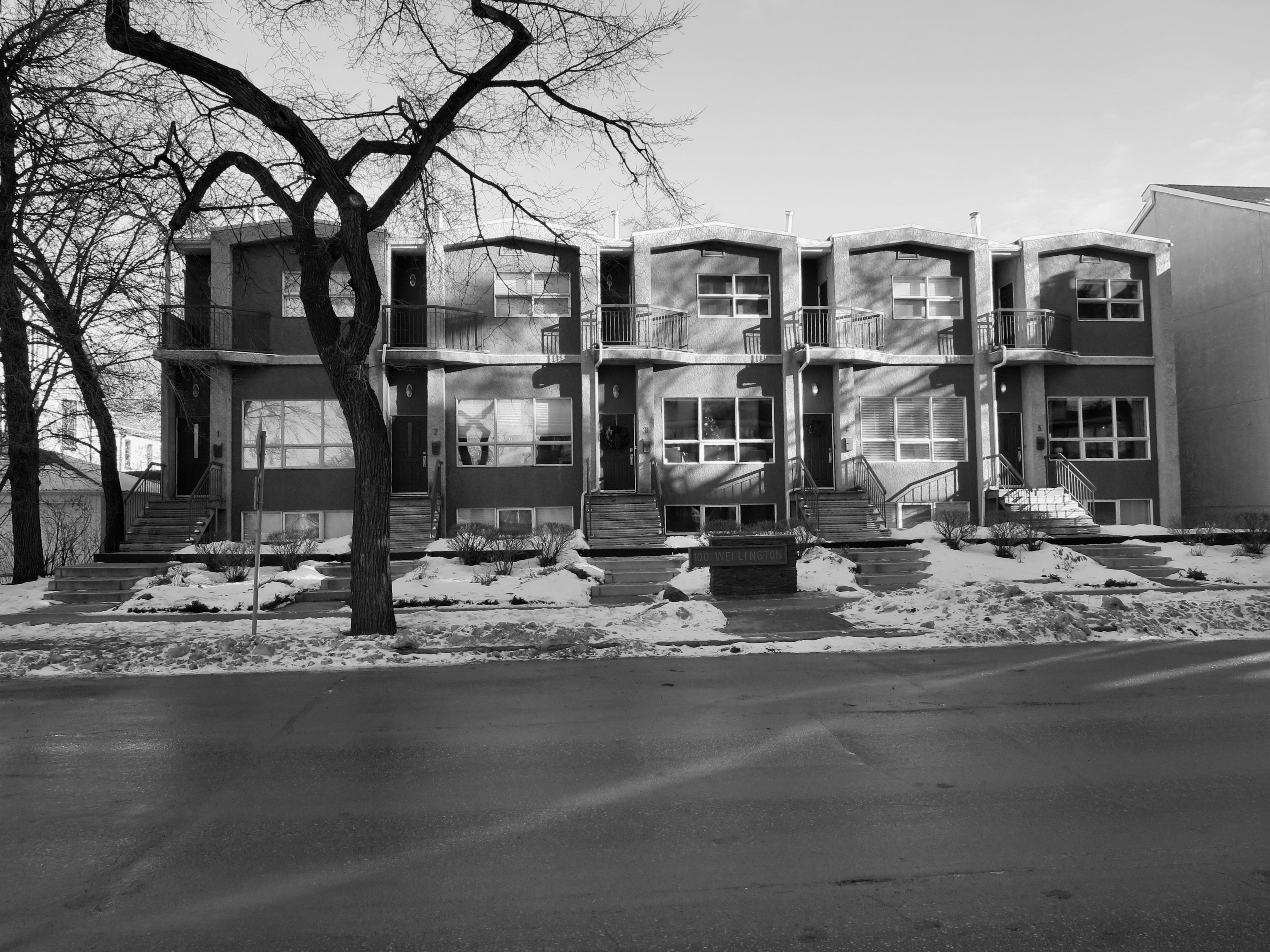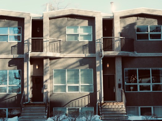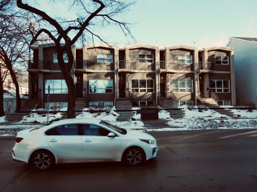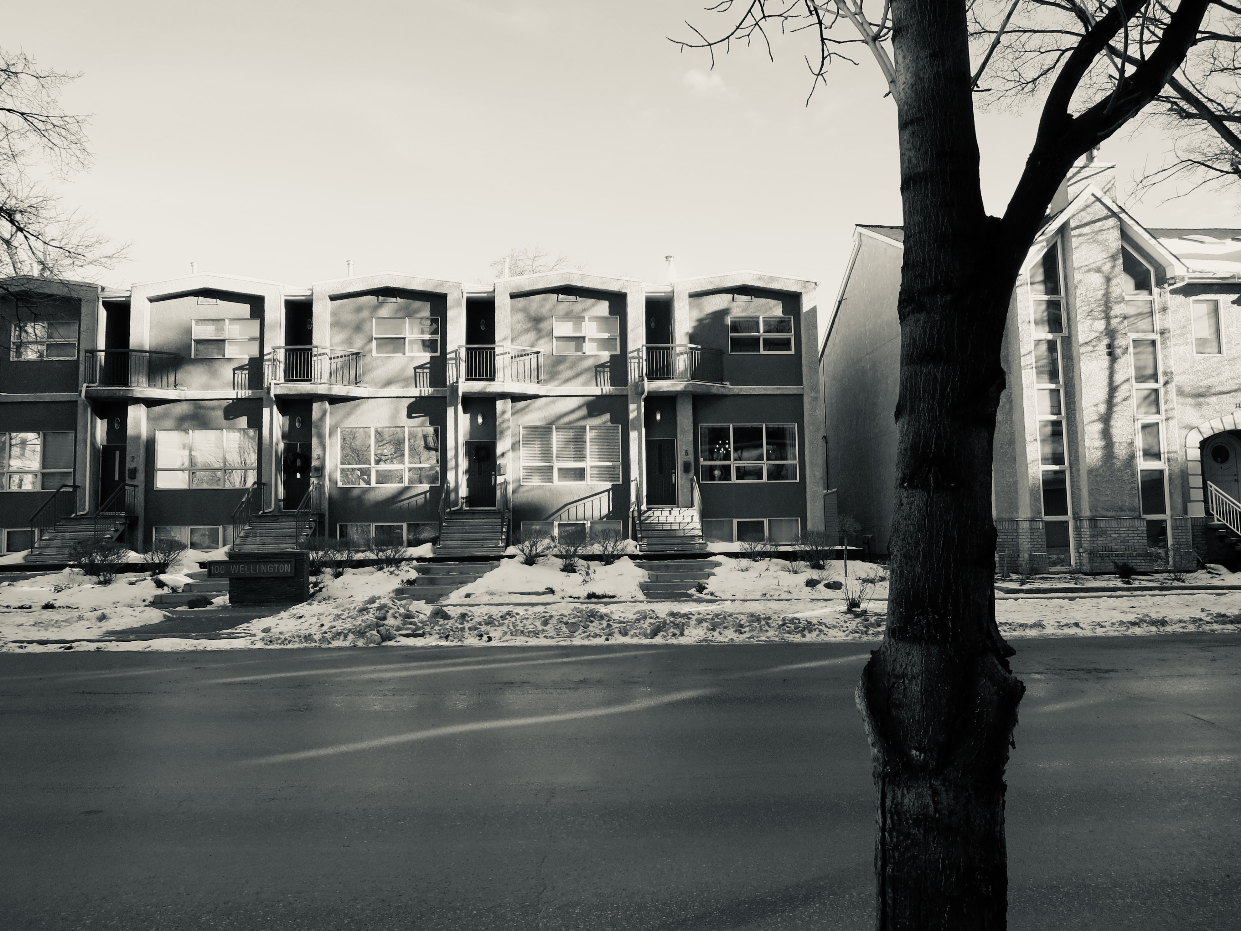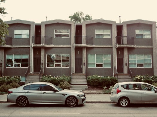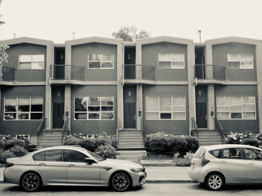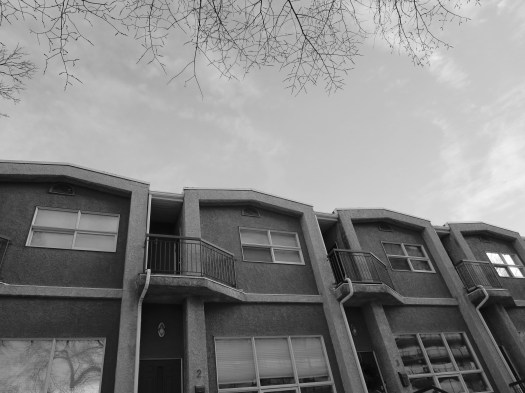 These townhouses are really nothing special until you notice the shape of the trees, or certain vehicles that are parked in front, or how the sky is lit. Or if you see it in a different tint, in black and white, or in silver tone.