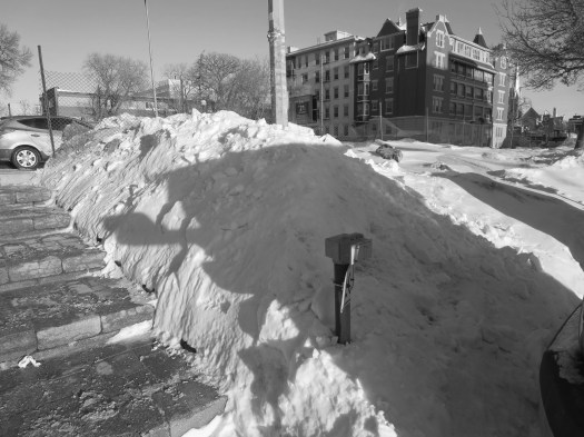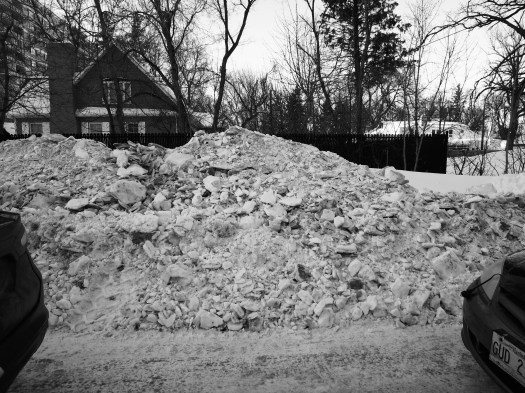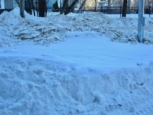 1. Excellent pictures with the snow piles, the various contrasts of shadow, and of course, the dirt. You’re right the snow will melt and we will be complaining about the heat and those horrid mosquitoes and other pests.