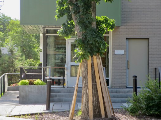 I was also pleased that they put boards around the lower trunks of the trees. Those poor trees have had a tough time of it lately, with the drought last year and the late spring this year, Dutch elm disease, and various pests. So many of them have already died or have been marked for removal. The remaining healthy ones need all the help they can get.
