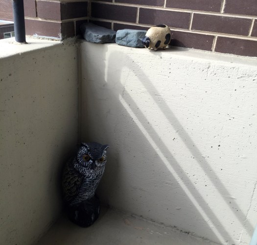 The sun was shining and Plump Cow had to blink before she could see anything. All around her were the cement walls of the balcony enclosure. She decided she would have to go up on the ledge to get a better view. Plump cow leaned back on her hind legs, rocked back a few times, then swooped up, landing just along the edge. Something in the corner caught her eye. “What the hell is an owl doing here?” said Plump Cow. Where did she pick up language like that?