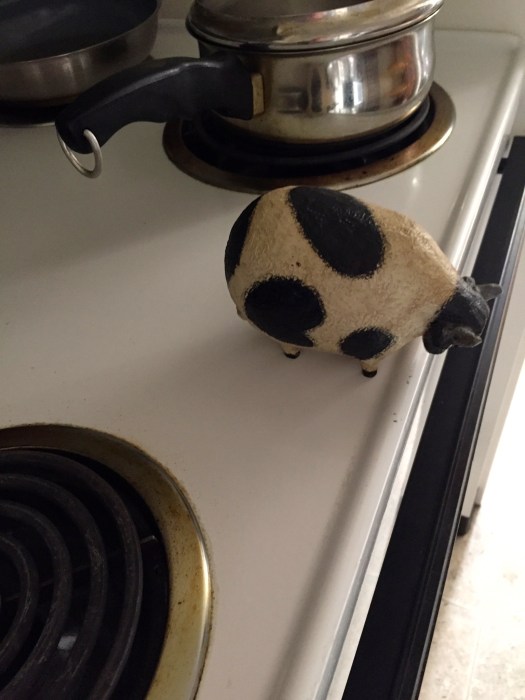 Plump Cow veered into the kitchen and made her way to the stove. She thought maybe she could take up cooking. But someone had just turned off one of the elements and it was a little too hot for comfort up there.