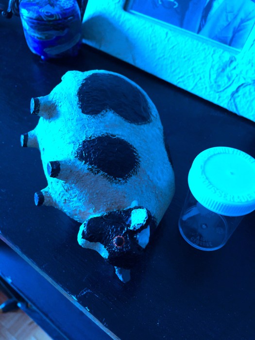 The soothing blue light helped Plump Cow relax while the glue set her ear and horn back into place. “Soon, soon, soon…” She repeated her mantra.