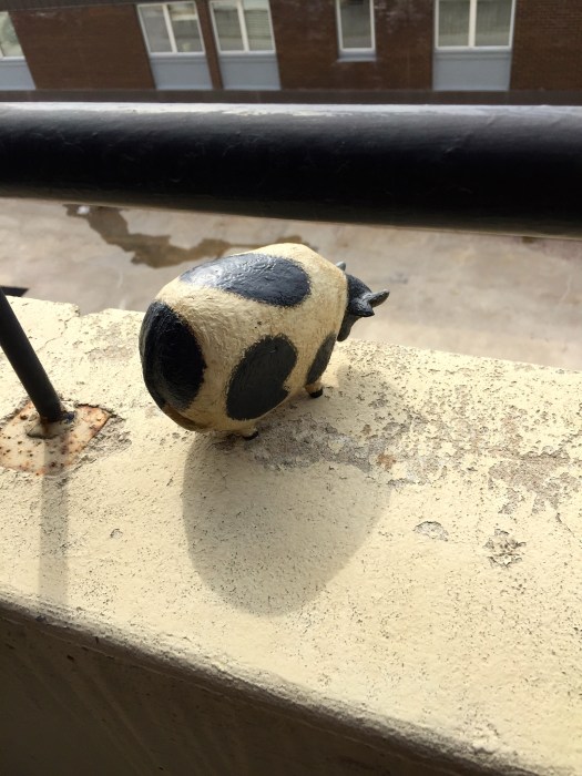 After establishing that the owl was not going to move, probably because it was daytime and she was sleeping (though the open eyes confused the issue), Plump Cow decided to skip over the owl area and make her way to the open edge of the balcony. “Oh my God, this isn’t going to work, we’re four floors up! I’d be smashed to bits when I landed down there.” She felt dizzy and her stomach was turning. She backed away. “This ain’t no Hitchcock film and I don’t have Cary Grant with me.”