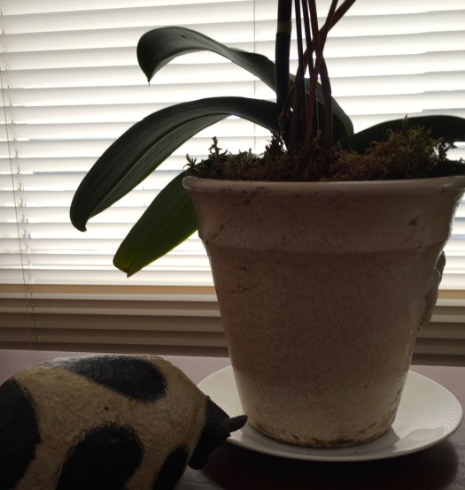 Plump Cow woke up and stretched, shaking off her nap. She was feeling a little peckish and thought she might have been imagining the smell of plant life. “What shall I do,” she said. Then she saw it, a plant pot holding an orchid. She had no interest in the orchid, but the damp mossy stuff in the pot had promise. Plump Cow hopped up, as much as a plump cow can hop, onto the fancy table thingy.