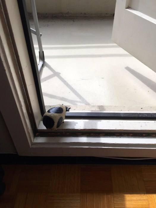 After a satisfying meal Plump Cow made her way to the balcony door. For years she had watched that door swing open and shut. She was nervous, but today was going to be the day that she got up the courage to trot out into a much bigger world.