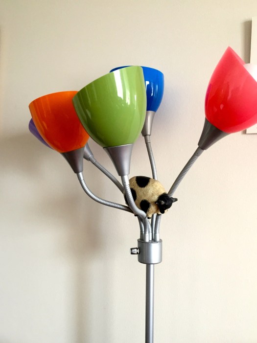 While lying on the couch Plump Cow looked up and saw some beautiful colours. They were part of the fancy lamp. “I’m going up there.” She shimmied up the lamp pole, not thinking about the danger.