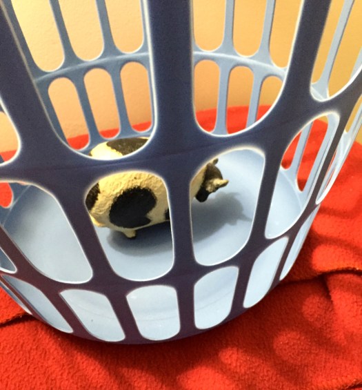 “Phew! That room was a minefield,” said Plump Cow, after she had squeezed her way through a space in the plastic laundry basket and made her way back to the living room couch. She lay down and rolled over, scratching her back like a cat.