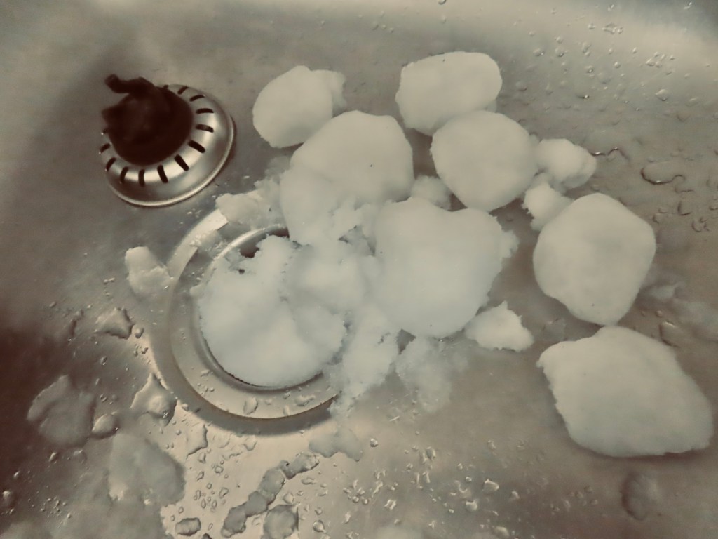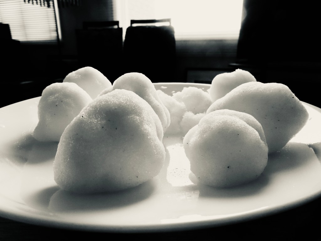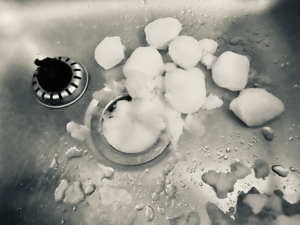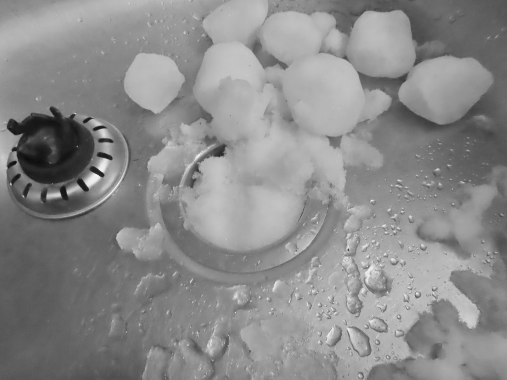 In February, I asked my Facebook friends to give me suggestions. Lori Broadfoot suggested snowballs. Elaine Pollard suggested reflections in puddles on a shiny surface (and there’s a bit of that in the kitchen sink shots).