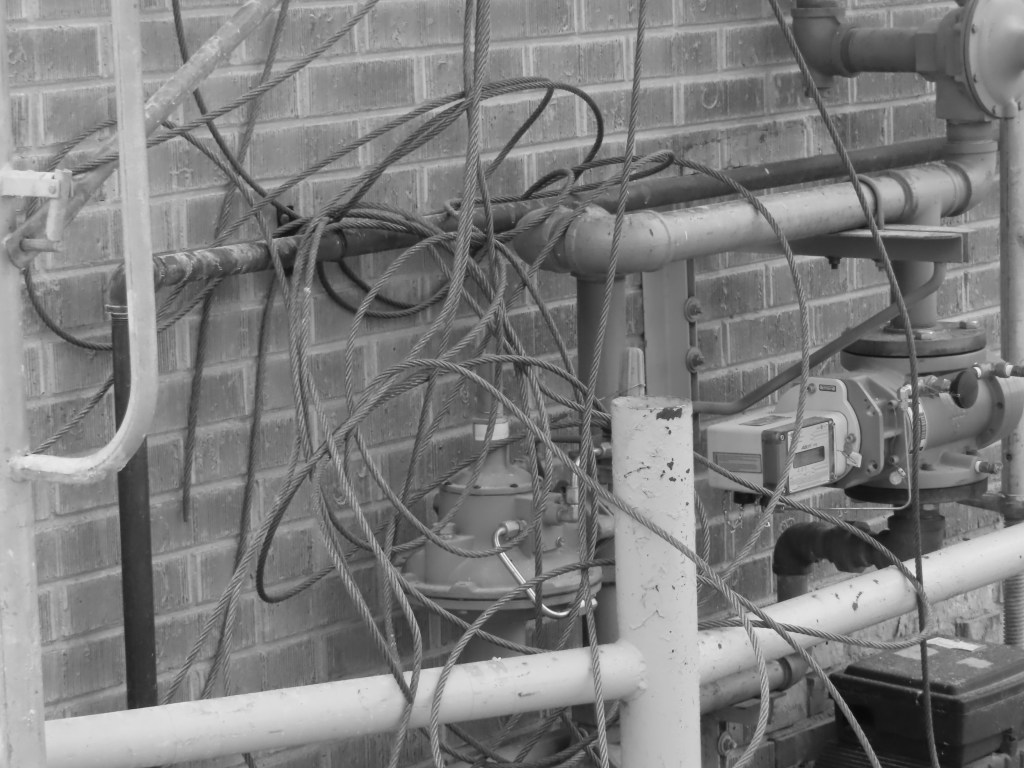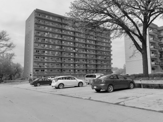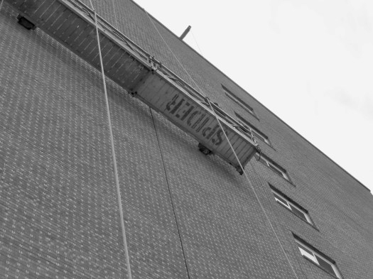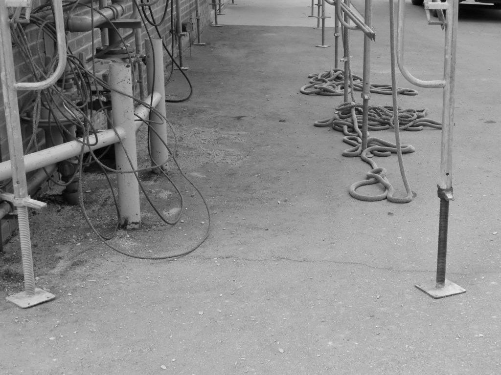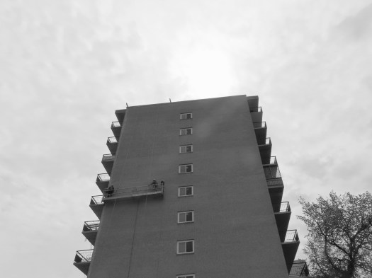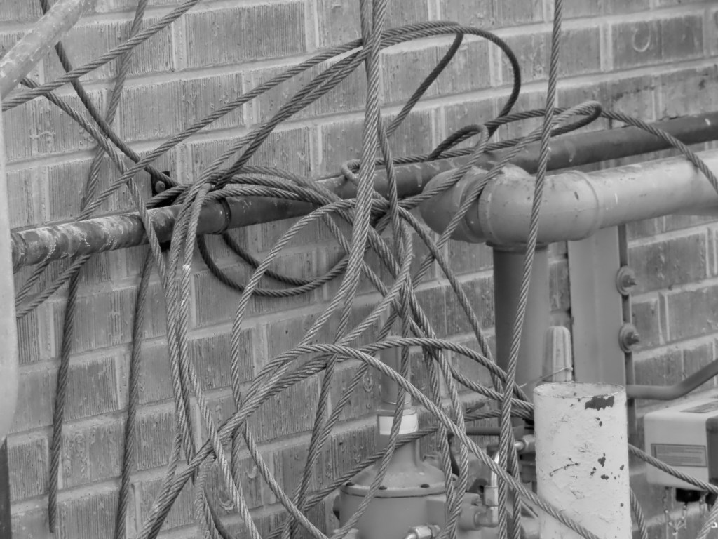 I was cutting across a parking lot down a back lane when I stopped to take a shot of an apartment building. When I turned the corner I saw a bunch of cables and ropes on the ground and looked up to see the bottom of a platform.