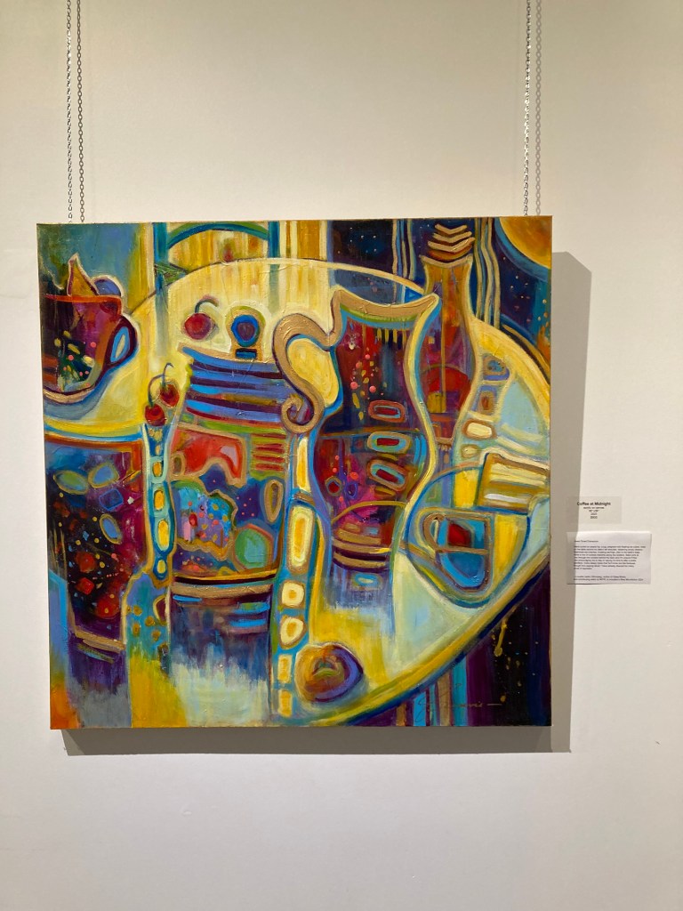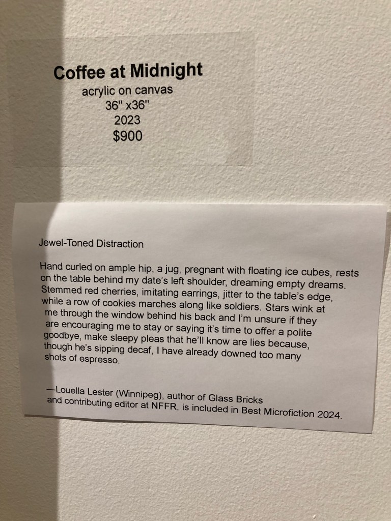 “Jewel-Toned Distraction,” a prose poem in response to Genevie Henderson’s painting, “Coffee at Midnight” shown in Poetry of Painting at Prairie Fusion Gallery in Portage la Prairie, Manitoba, Canada. November 2024. Photo below.