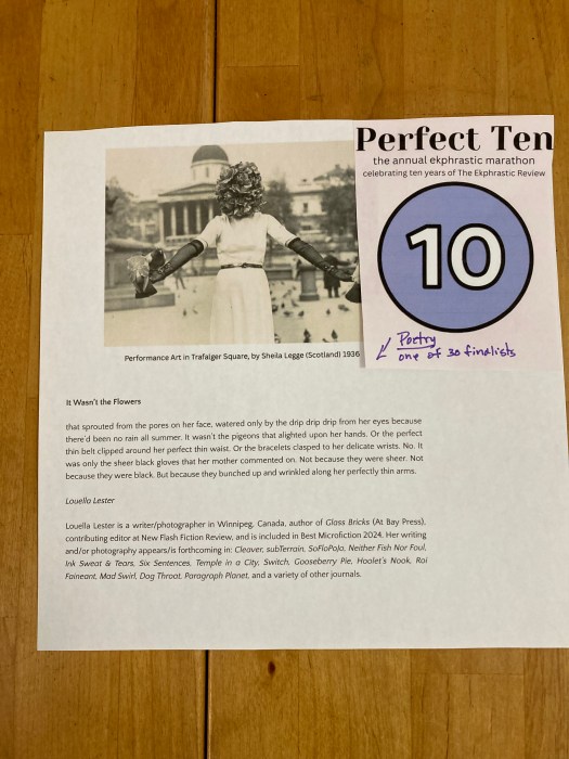 “It Wasn’t the Flowers,” Ekphrastic Review – annual marathon – Perfect 10, poetry finalist, September 15, 2025. Read in photo below or click on link above and scroll down list which is alphabetical by poets’ last names.